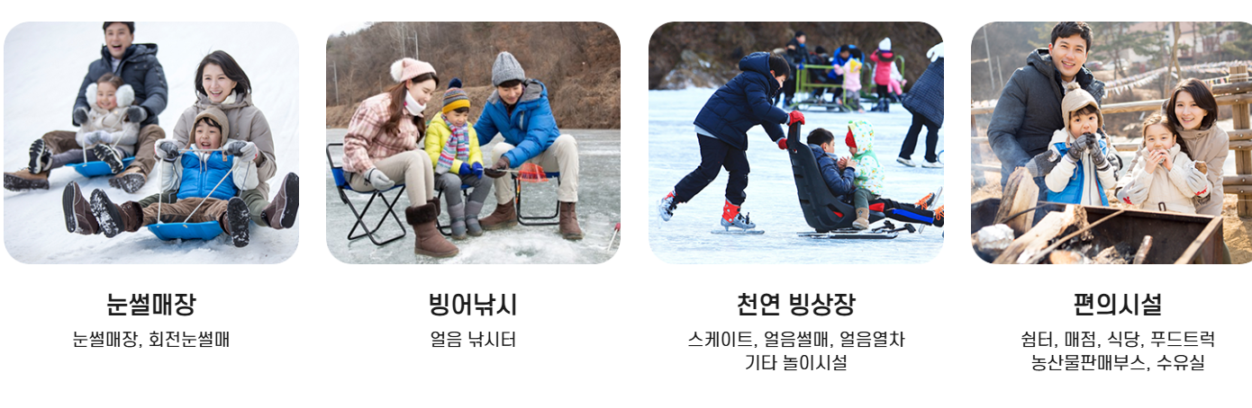 - 체험 및 프로그램 : 얼음낚시터 운영/빙상장 운영/얼음썰매 타기/ 얼음열차 운행/눈썰매장 운영/스릴만점 회전눈썰매